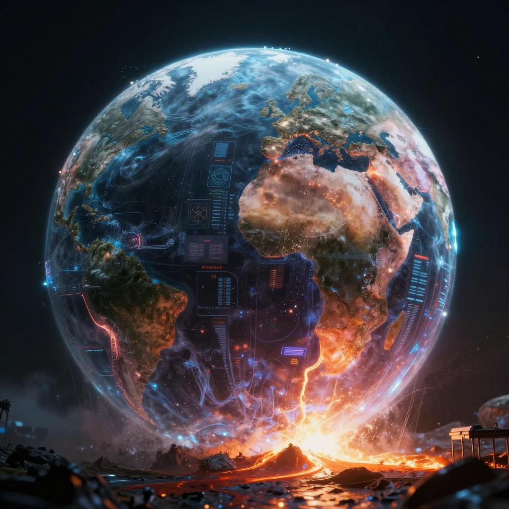Cinematic still piercing light, (aesthetic:1.1), (dim colors:1.2), , A futuristic epic disaster scene of Earth drowning in another planet made of translucent materials, and its internal structure is clearly visible, including magma spills and light-emitting explosions. its precise construction and possible geostructure . High-tech and futuristic holographic scan of planet body, bioluminescence, fiber optics, masterpieces, octane rendering, unreal engine, intricate details, UHDR, 32K . emotional, harmonious, vignette, 4k epic detailed, shot on kodak, 35mm photo, sharp focus, high budget, cinemascope, moody, epic, gorgeous, film grain, grainy, piercing light, including magma spills and light-emitting explosions. its precise construction and possible geostructure. High-tech and futuristic holographic scan of planet body, 32K, cinematic, professional, winning candid, highly detailed, warm color, modern, stylish, amazing, awarded, best, romantic, dramatic, contemporary, deep vibrant, complex, original, beautiful, sleek