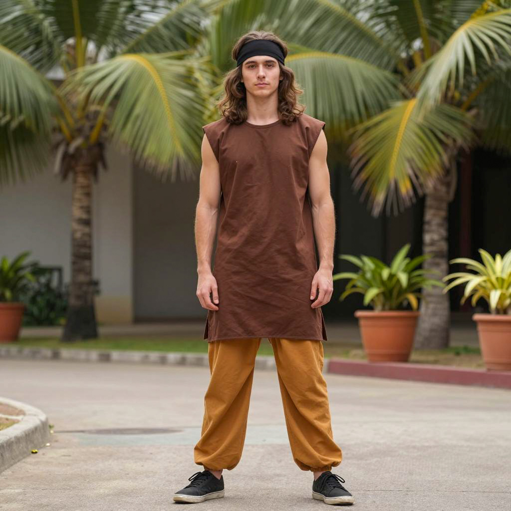 Coco costume, photograph of a young man standing outdoors, wearing a brown ured sleeveless tunic and mustard-colored pants, black sneakers, long brown hair, black headband, palm trees in background, potted plants, daylight, neutral expression, full body shot, casual style, slightly messy look, tropical setting