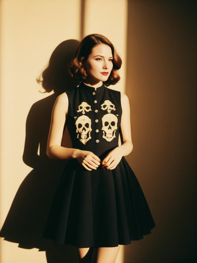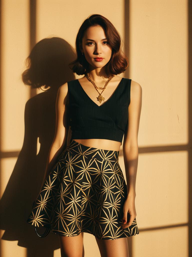 Portrait of a young woman wearing a black V-neck crop top with short sleeves paired with a high-waisted flared mini skirt featuring a bold floral pattern in red, yellow, and green on a black background. She has shoulder-length wavy brown hair and red lipstick, standing indoors against a plain warm-toned background with soft shadows.