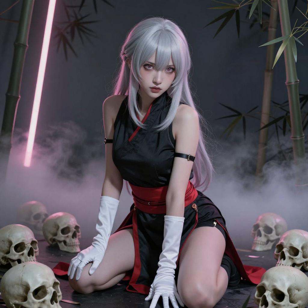 Digital anime-style illustration of a green-haired girl with elf ears, wearing a blue and white traditional outfit, kneeling and reaching forward. She has a blue hat with a white symbol, and her expression is focused. The background features black bamboo patterns, white curtains, and skulls on the floor, with misty blue light.