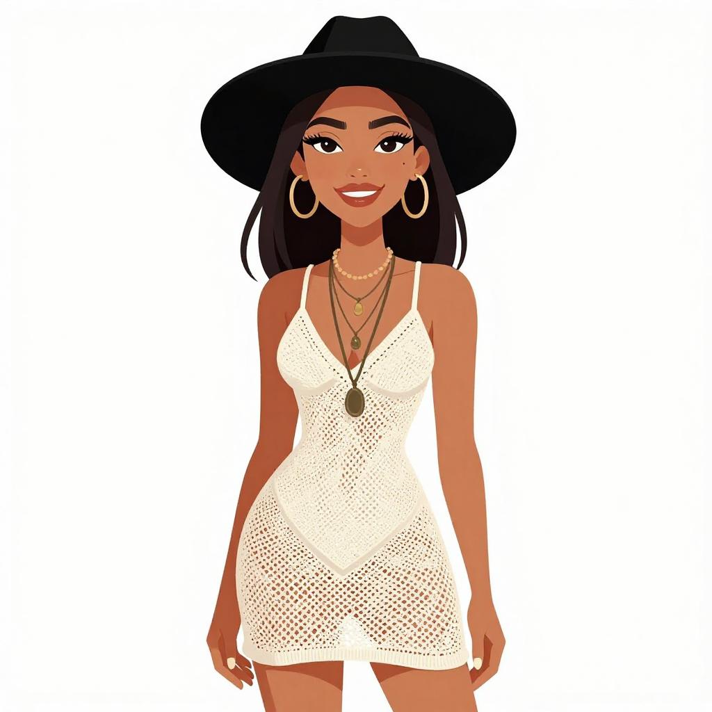 Woman with pretty face and pretty hair. smiling Woman, bohemian chic, white crochet knit mini dress, V-neckline, thin spaghetti straps, slight flare at the hem, layered necklaces with varying lengths and pendants, wide-brimmed black floppy hat, white background. --sref 1467