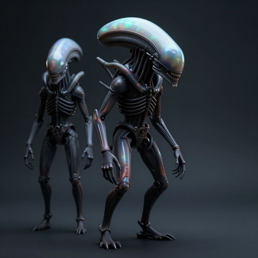 (futuristic xenomorph1.0), (full body xenomorph3.0), minimalistic suite, Iridescent opal style, macro, concept art, masterpiece, (fractal:0.5), fulcolor, dark noir, muffled light, realistic, soft shadows, best quality, hyper detailed