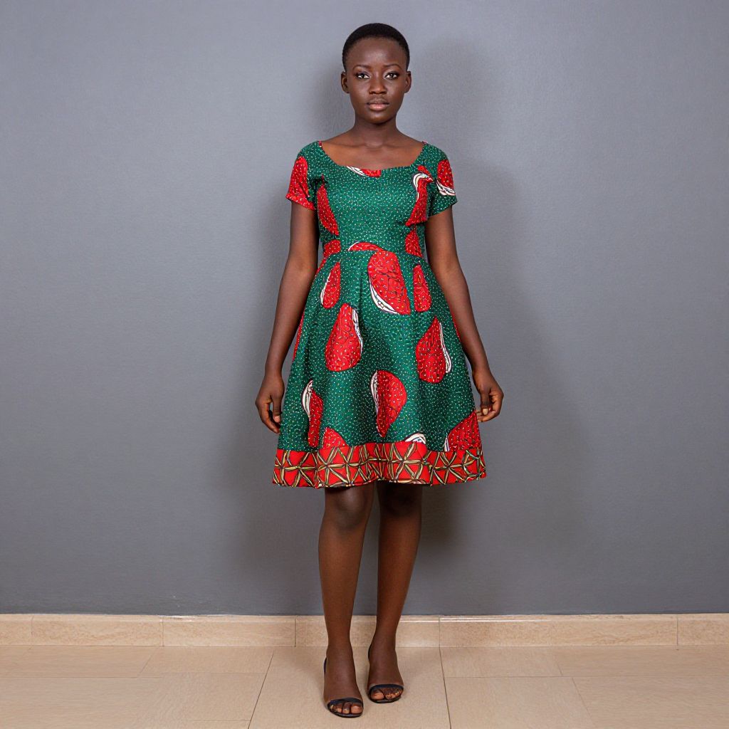 "Short Fancy Chitenge Dress, woman in a green and red dress standing in front of a wall"