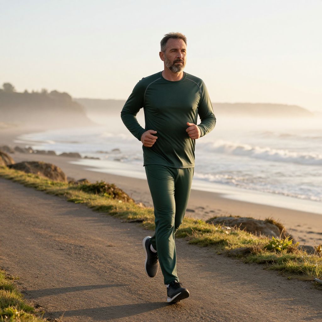 A middle-aged man with a beard and calm eyes jogging on a coastal trail at sunrise, dressed in durable, moisture-wicking sporty bottoms in deep green with a slight reflective trim, the setting features waves gently lapping against the shore, a foggy horizon, and soft golden morning light casting long shadows