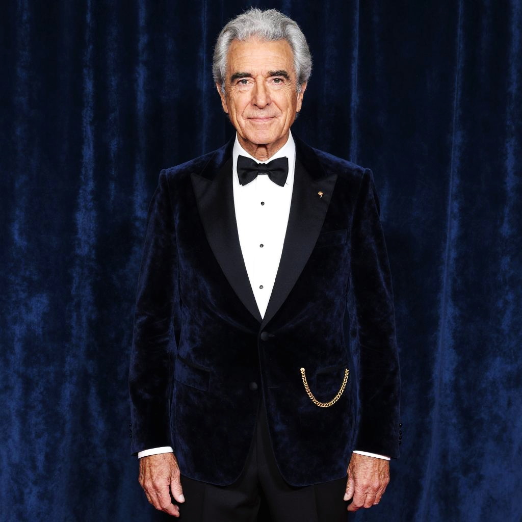 Photograph of an elderly man with short, silver-gray hair, standing against a dark blue velvet curtain. He is wearing a black velvet tuxedo with a white dress shirt, black bow tie, and a small gold chain on his left jacket pocket. His expression is calm, and he stands with his arms relaxed at his sides. The lighting highlights his face and the texture of the velvet, creating a formal and elegant atmosphere. The overall composition is centered, emphasizing his dignified appearance.