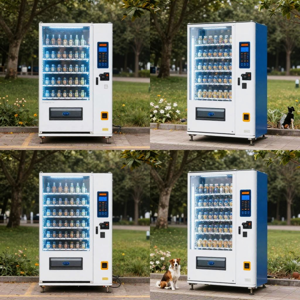 This image is a collage of four photographs showing a small, modern vending machine with a white and blue exterior. It's placed outdoors in a grassy park with trees in the background. The machine has a glass door, shelves, and a digital display. In one photo, a dog is sitting in front of the machine. The machine emits a bright blue glow in some photos.