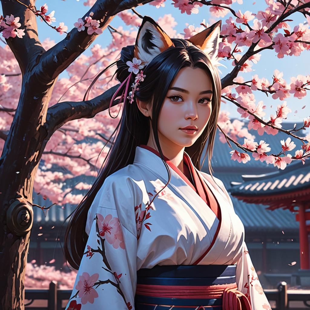 Fantasy Woman with Fox Ears in Kimono by Sakura Tree
