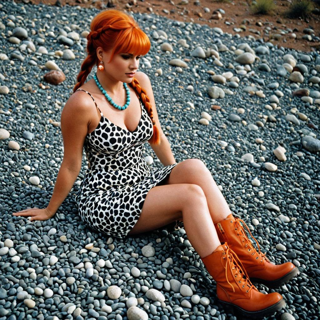 Adult pebbles flintstones,1girl, solo, jewelry, boots, earrings, dress, braid, orange hair