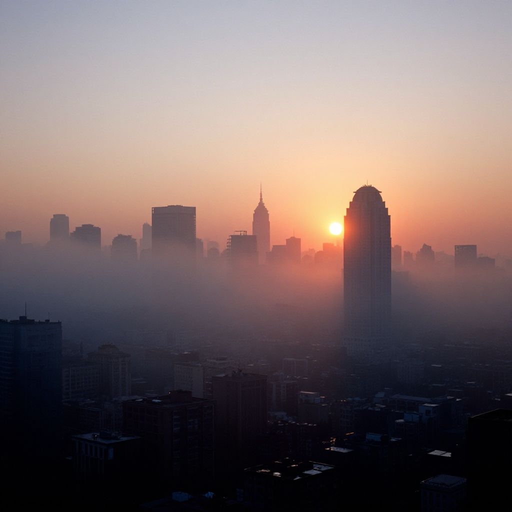 Photograph of a city skyline at sunrise. The sun, partially obscured by mist, casts a warm orange and pink glow across the horizon. Silhouetted buildings, including a prominent, rounded skyscraper to the right, create a dark, shadowy contrast. The mist envelops the lower part of the city, adding a hazy effect. The sky transitions from bright orange near the sun to a deeper blue at the top. The overall scene evokes a peaceful, early morning atmosphere with a blend of natural light and urban architecture.