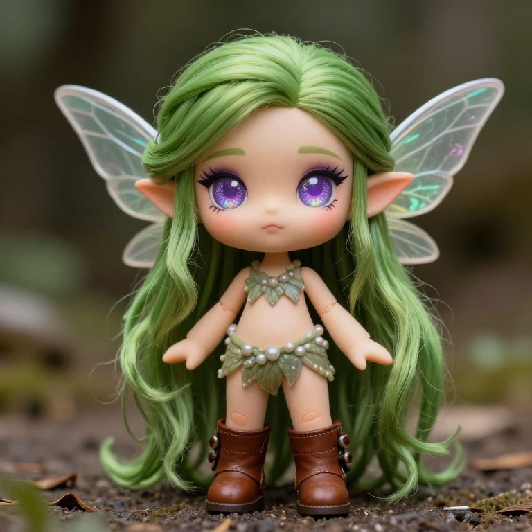 Retro Fashion Accessories Portrait of a dnd character, fairy, purple eyes, colourful shimmer, small transparent wings, long green hair, wearing leather boots, high detail,