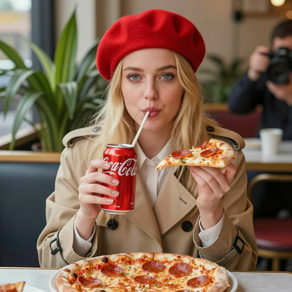 Photograph of a blonde woman with blue eyes, wearing a red beret and beige trench coat, sitting at a table. She holds a can of Coca-Cola in her right hand and a slice of pepperoni pizza in her left hand. She has a straw in her mouth. In front of her is a pizza with pepperoni on a white plate. Green plants are in the background. Her expression is neutral. Her long hair is straight. The photographer's is in the top right corner.