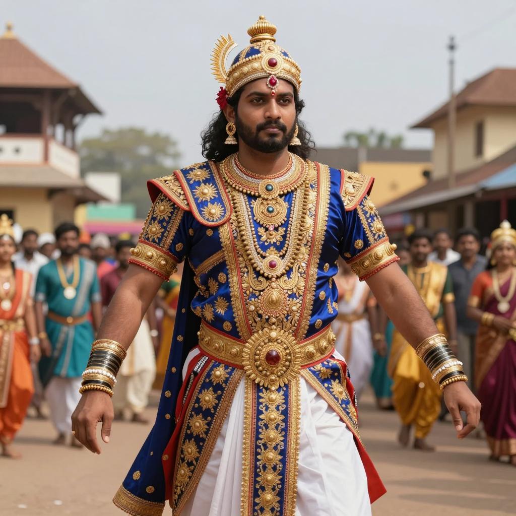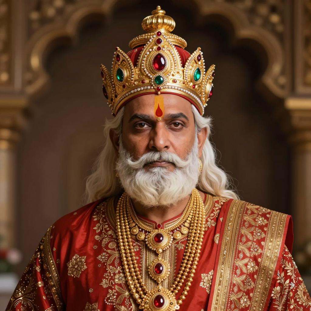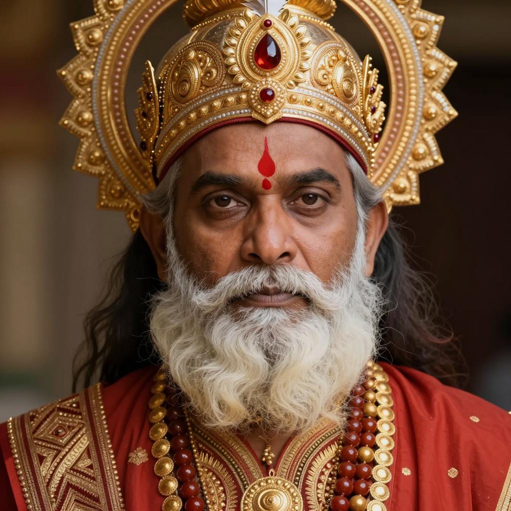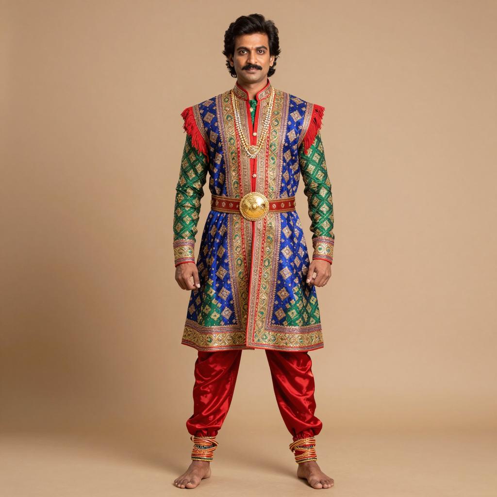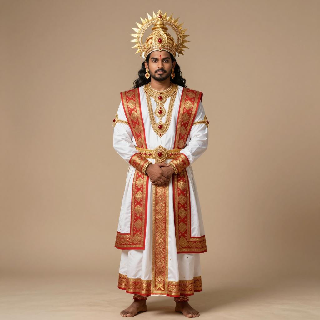 Goddess costume male, photograph of a man, standing, full body, traditional Indian deity or king attire, white robe with red and gold patterns, ornate gold crown with radiating sunburst design, long black hair, hands clasped, brown skin, medium build, serious expression, background is plain beige, studio lighting, elaborate jewelry, necklace, earrings, traditional Indian cultural costume, regal and majestic, portrait style, detailed ures, symmetrical composition, historical or mythological representation, warm color palette, traditional Indian art style.