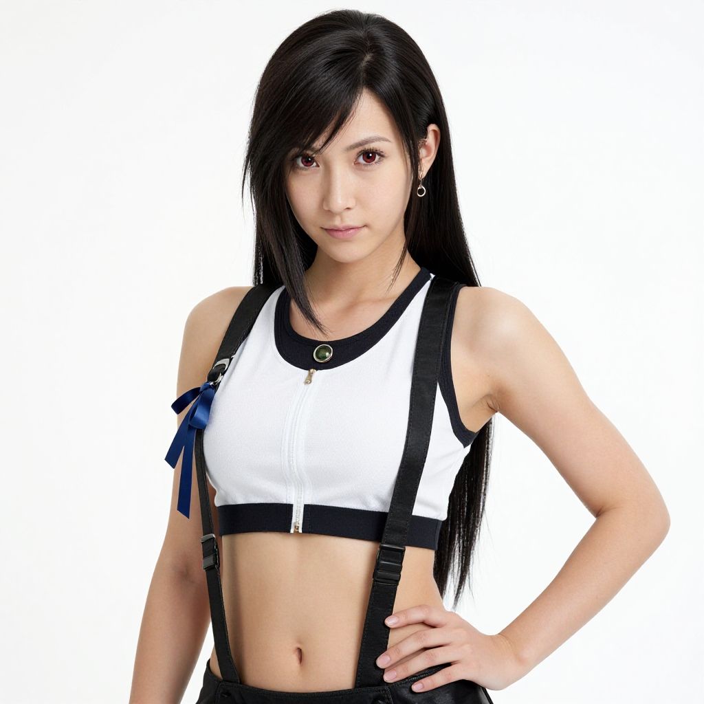 Tifa lockhart, (final fantasy vii advent children), 1girl, arm ribbon, zipper, bare shoulders, black hair, breasts, closed mouth, crop top, earrings, hand on hip, jewelry, large breasts, long hair, midriff peek, navel, red eyes, ribbon, shirt, simple background, sleeveless, sleeveless shirt, solo, white background, black apron, ((bare arms)), white zipper, brown eyes