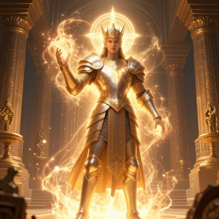 Digital artwork of a powerful, armored king with glowing crown, holding fiery magic, standing in an ornate, golden, temple-like hall.