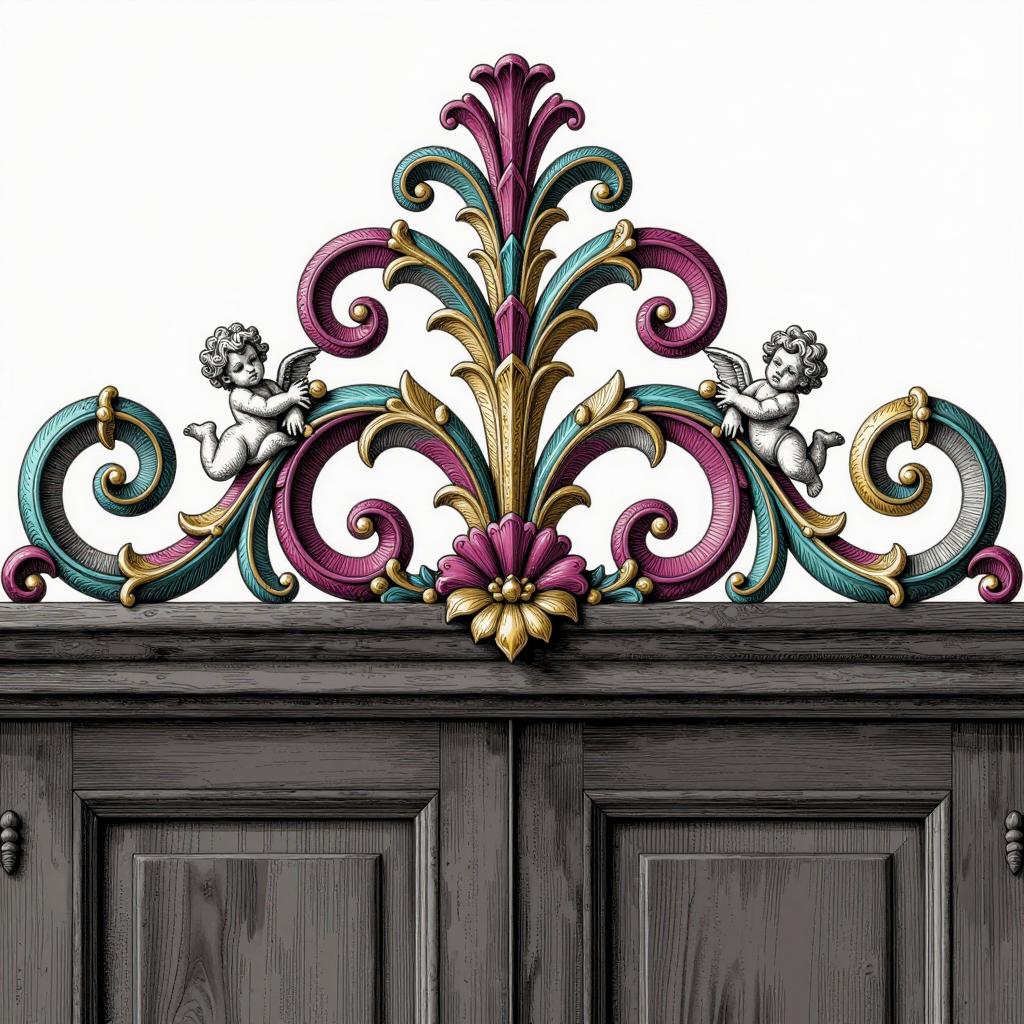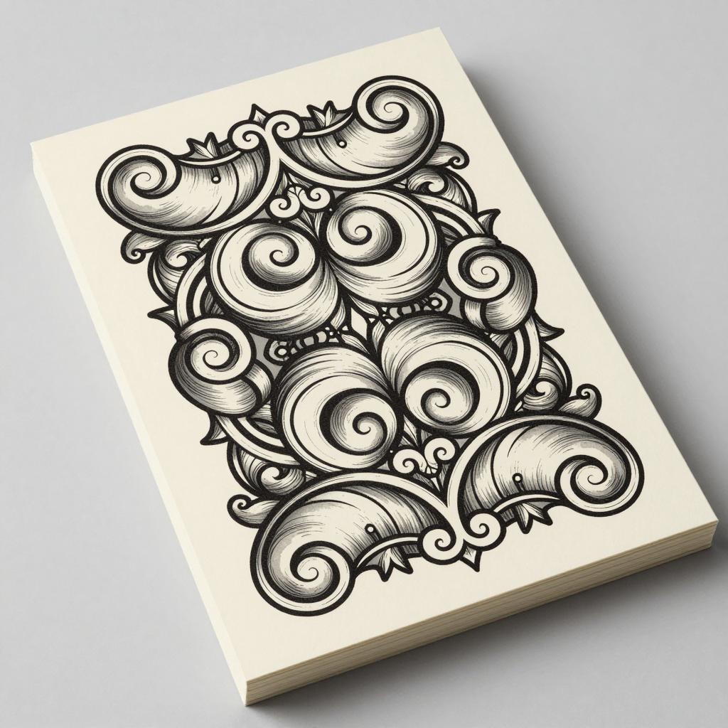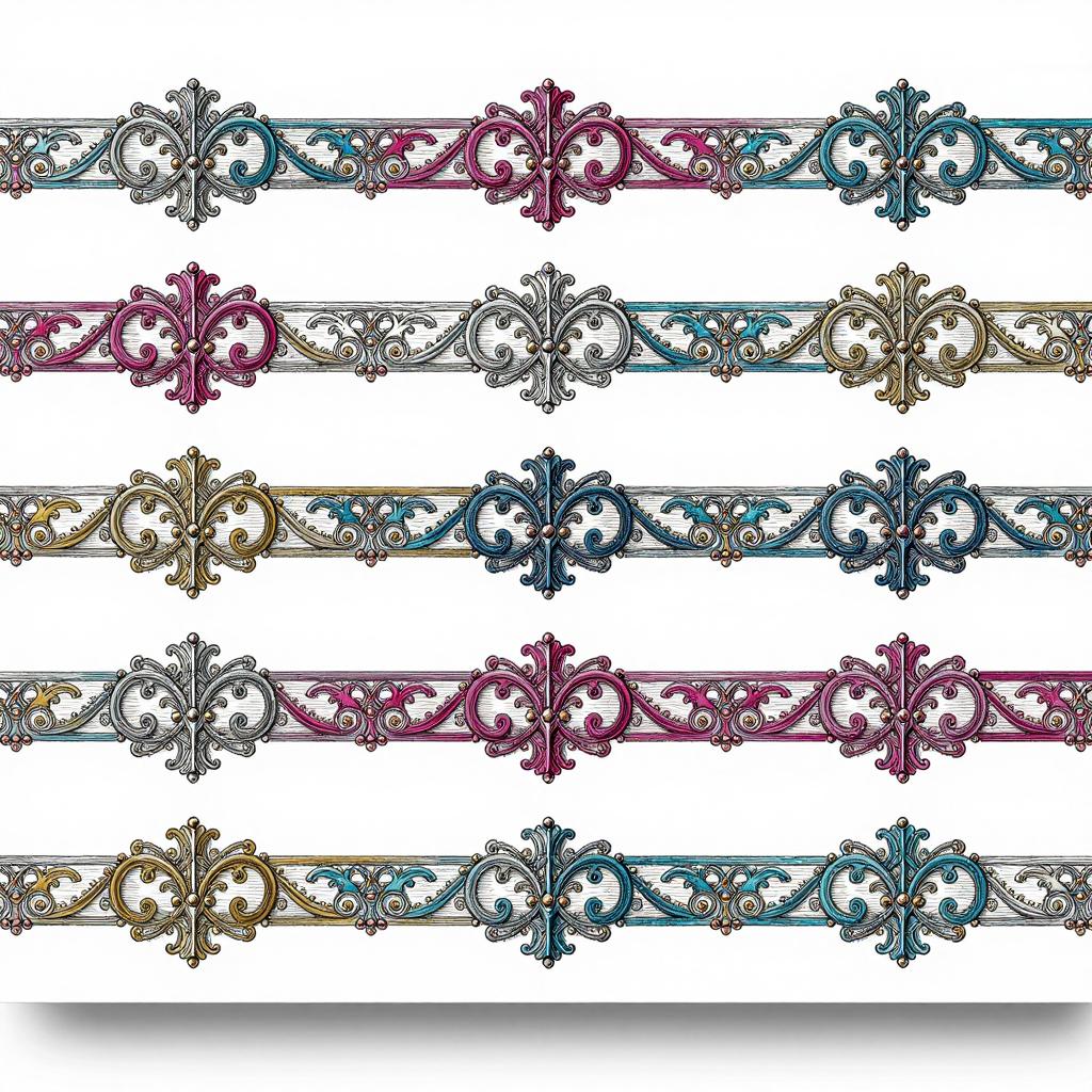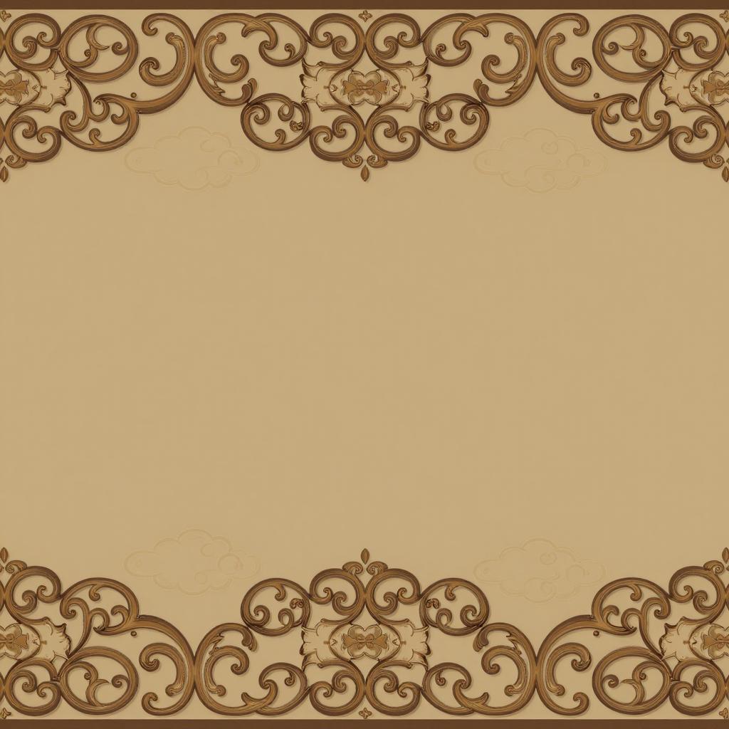 Scrollworks pattern featuring Heraldic scrollwork framing shields and crests in rose-gold scrollwork on soft blush pink arranged as symmetrical mirror-image scrolls left and right of center on ornate invitation or certificate background rendered as vector art with clean crisp edges and flat fills, ultra-detailed, sharp ornamental design, high resolution, intricate decorative pattern art