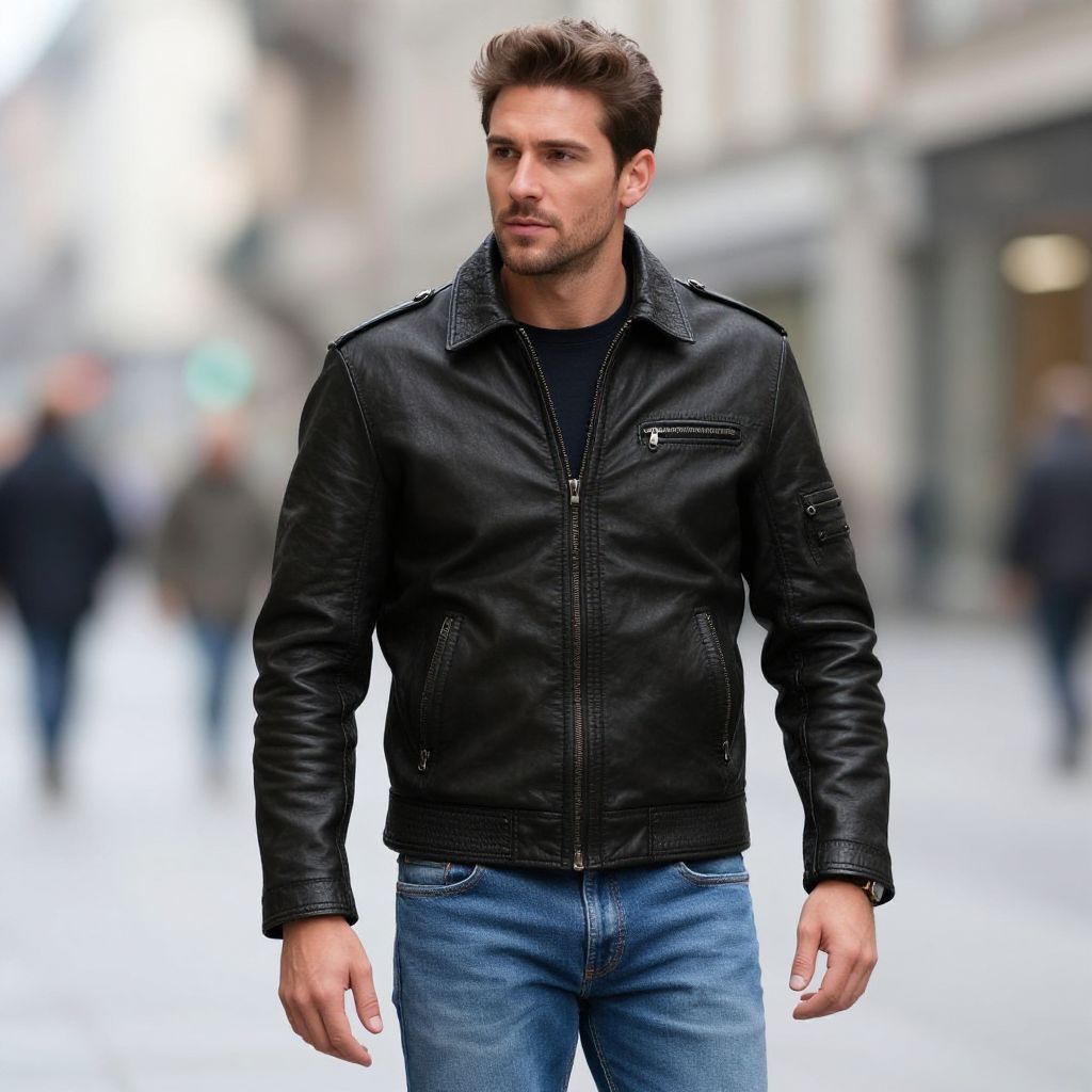 Photograph of a handsome man with short, slightly messy brown hair and a trimmed beard. He's wearing a white dress shirt, black leather jacket, and black scarf. His black pants and fingerless leather gloves add to his edgy look. The background is a plain, gradient gray, keeping all the focus on him. He's standing confidently, looking directly at the camera with a serious expression.