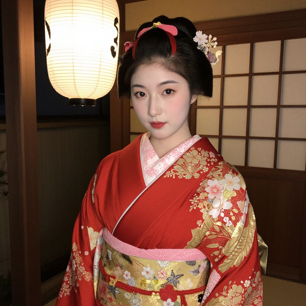 Photograph of an East Asian woman with fair skin and black hair styled in an updo with red hairpins and white flowers. She wears a vibrant red kimono adorned with intricate gold and white floral patterns and a pink and gold obi belt. Her makeup includes red lipstick and subtle eye shadow. She stands in a traditional Japanese room with dark wooden walls and a shoji screen in the background. A large, white paper lantern with black floral designs hangs from the ceiling, illuminating her face. The overall atmosphere is warm and elegant.