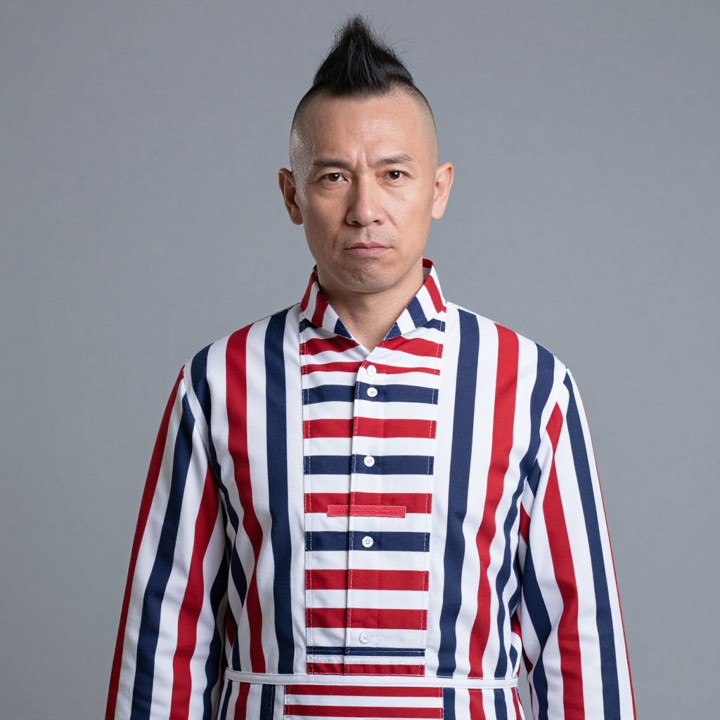 A man is wearing a red, white, and blue striped outfit with a mohawk on his head.