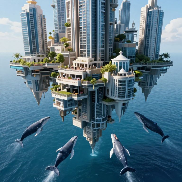 A digital CGI image depicts a futuristic, floating cityscape composed of tall, modern skyscrapers with glass and steel facades. The city, with lush greenery and white-roofed buildings, hovers above a calm, deep blue ocean. Six large, grey whales swim around the base of the city, their fins and tails breaking the water's surface. The bright, clear sky and sunlight enhance the scene's vibrant, surreal aesthetic. Palm trees and small balconies add a touch of tropical charm to the urban structure. The overall style is highly detailed and realistic, emphasizing a harmonious coexistence between city and marine life.