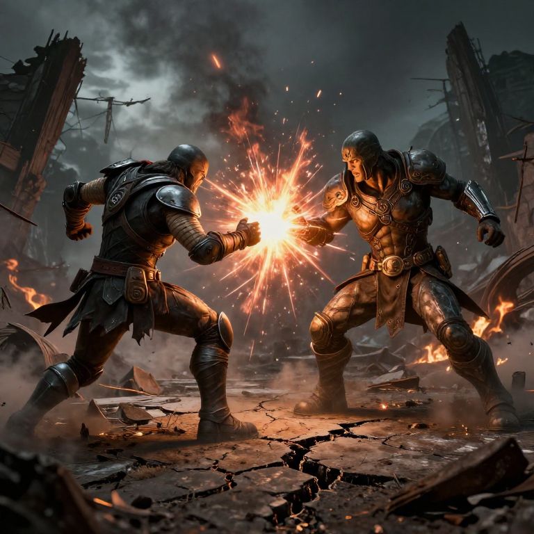 Bvs apocalyptic wasteland duel, cracked earth and ruins, two powerful figures locked in combat, fire and smoke effects, dark and moody tone, hyper-realistic textures, powerful energy blasts, ultra-detailed