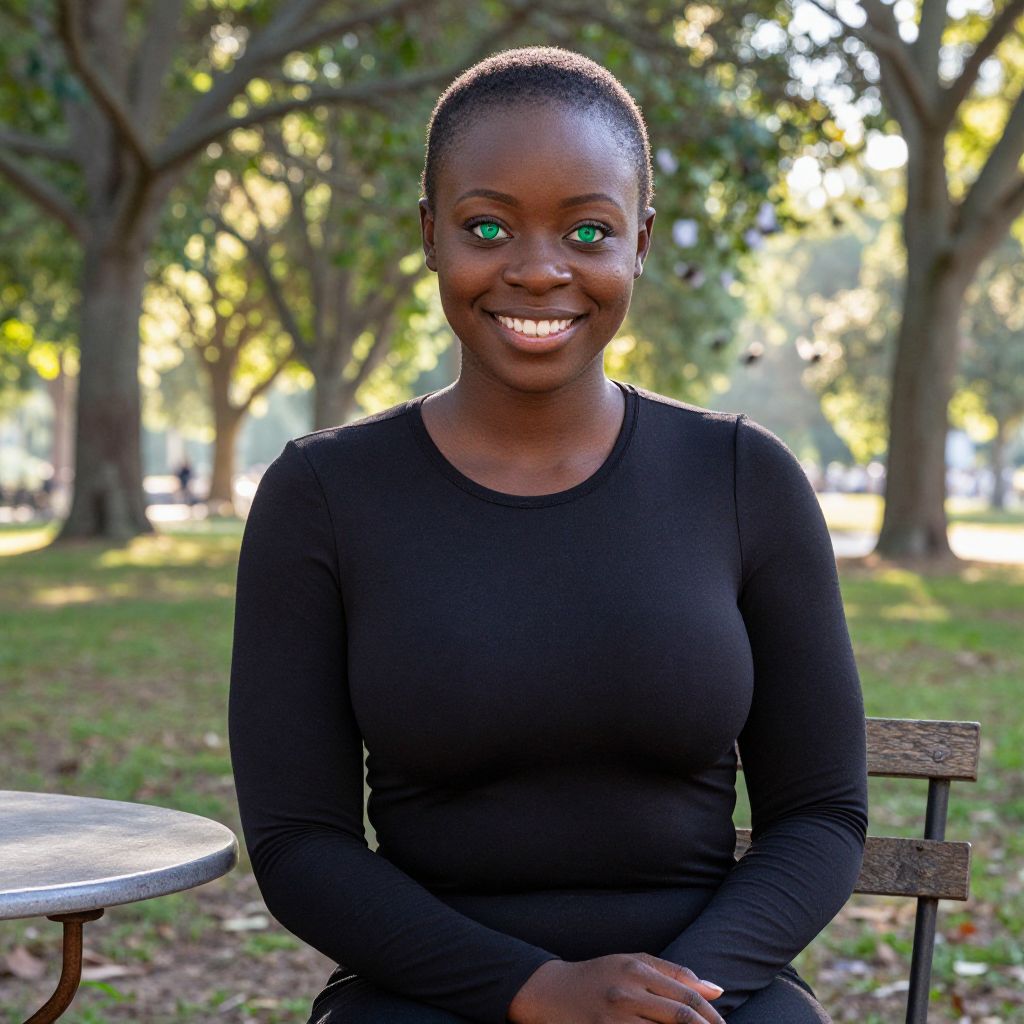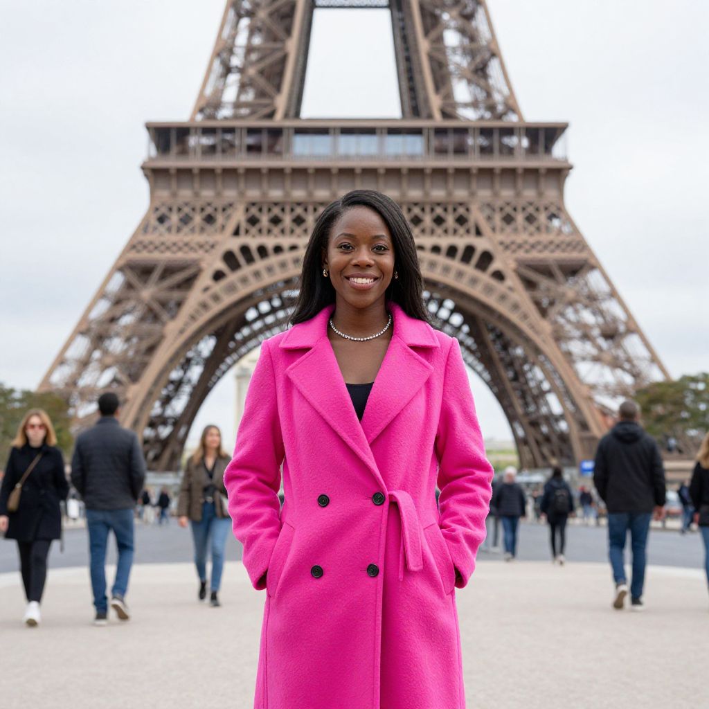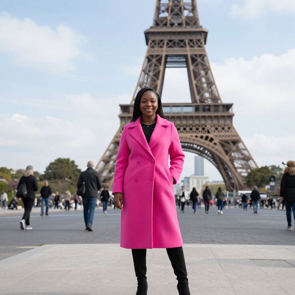 Smiling black woman wearing a vibrant pink coat stands in front of the iconic Eiffel Tower, surrounded by bustling Parisian streets and pedestrians.