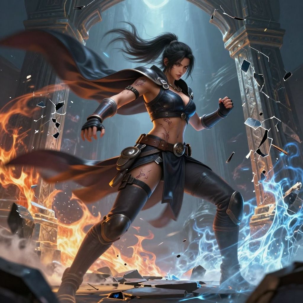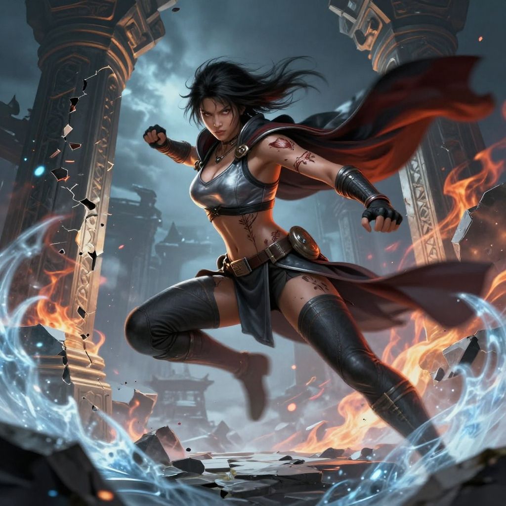 Girl from Mortal Kombat, fierce combatant with battle scars and flowing cape, dynamic motion blur, shattered stone pillars, elemental fire and ice effects, ultra-detailed fantasy art