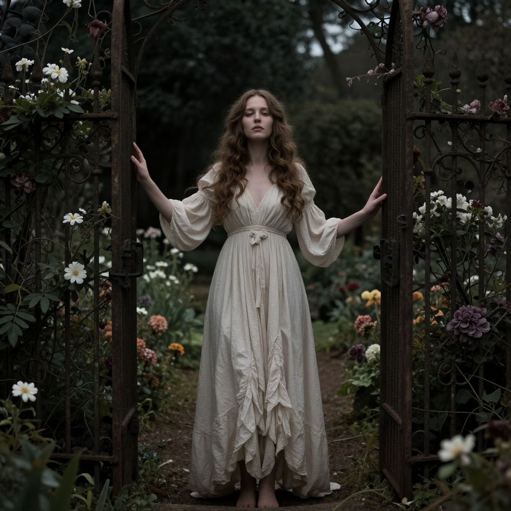 A gothic, ethereal woman in a flowing, cotton dress stands in a dream-like garden, framed by wrought iron gates and adorned with flowers, captured in a dark, moody, cinematic style reminiscent of Patricia Coelho's work.