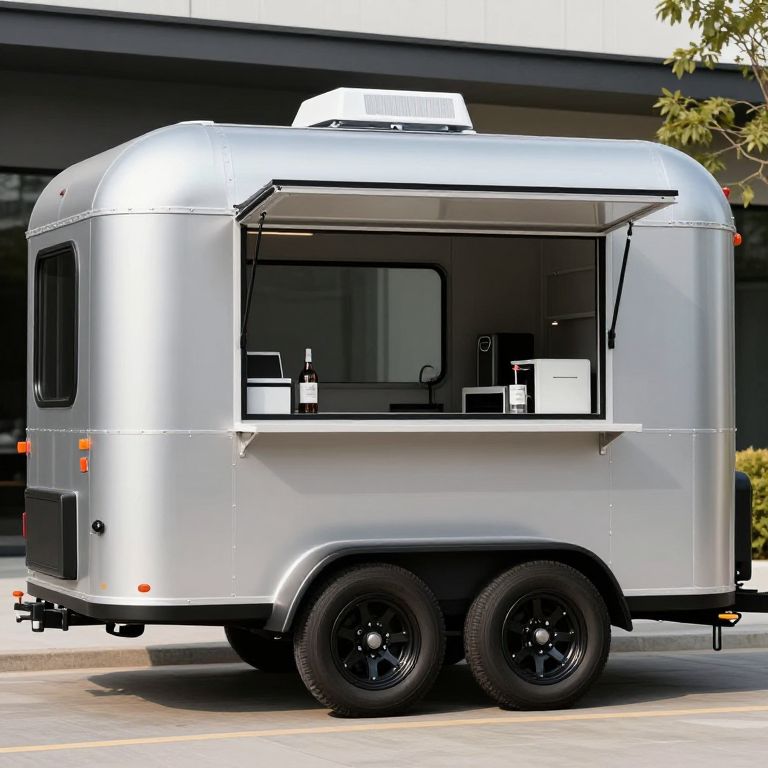 Modern 2019 inTech Trailers 20 Intech Custom Vending/Concession Trailer parked outdoors, featuring a sleek silver exterior, black accents, two large wheels, and a prominent serving window with an extended awning above.