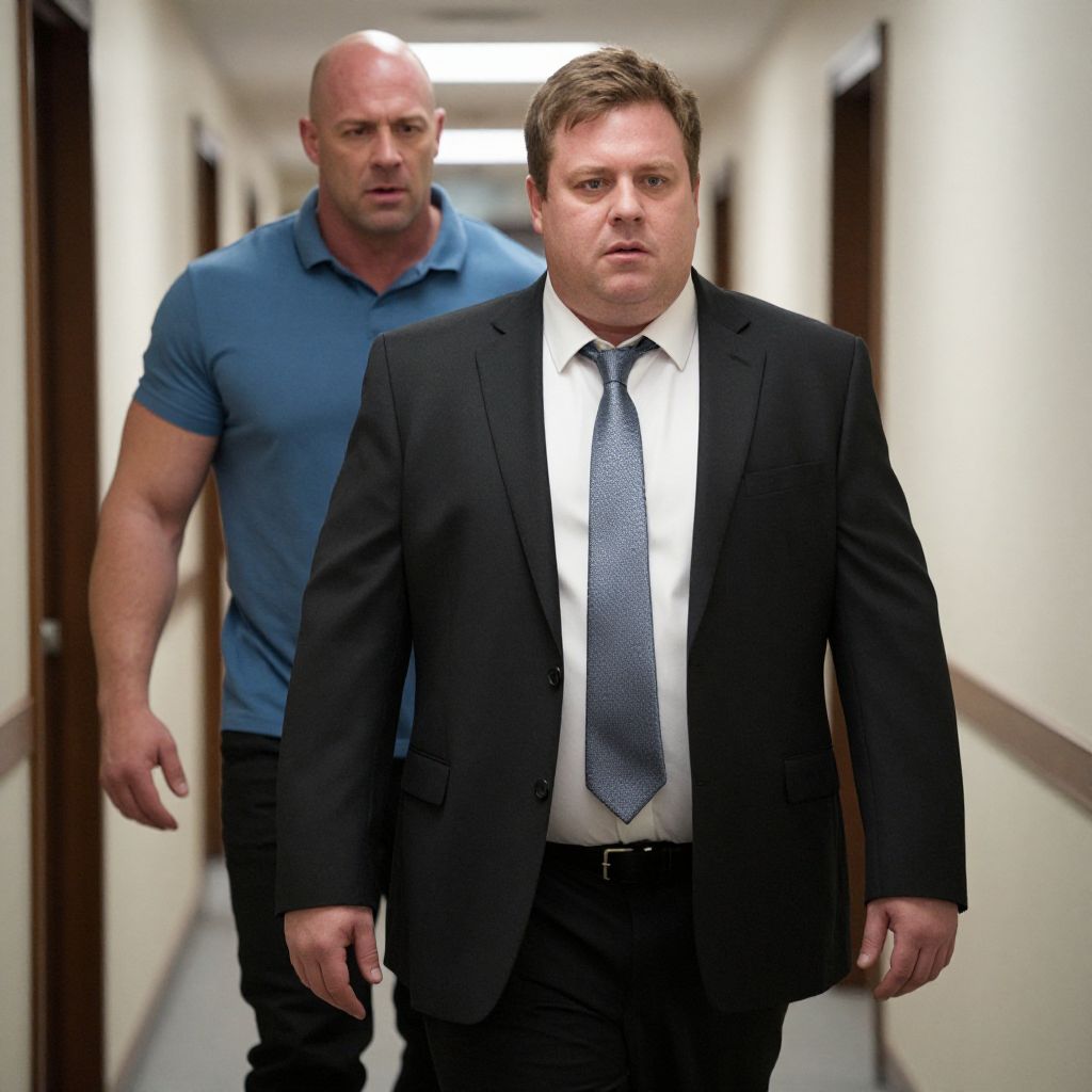 An overweight man in a suit and tie walks down a hallway, with a muscular man in a blue shirt standing behind him.