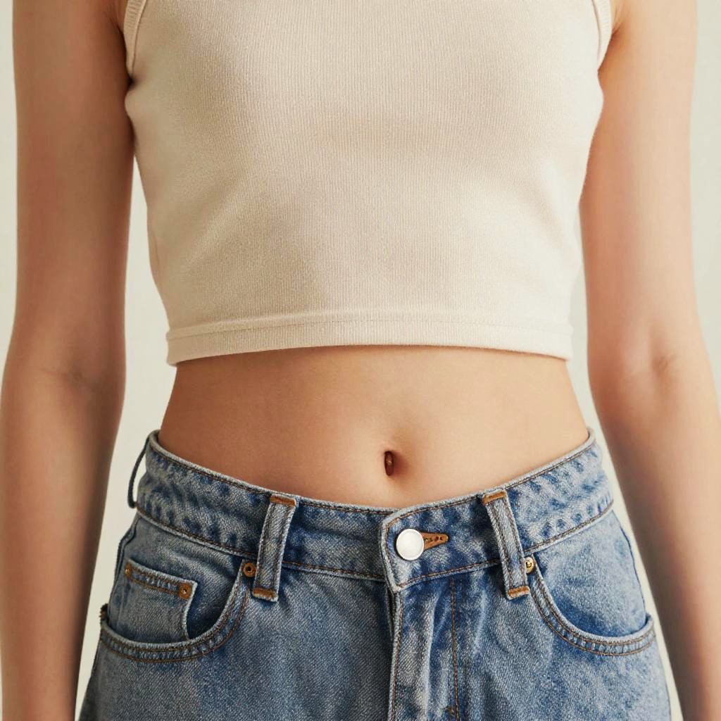Teen girl belly button close-up, soft natural lighting, casual summer outfit, warm tones, subtle smile, shallow depth of field, stylish and modern aesthetic, high resolution