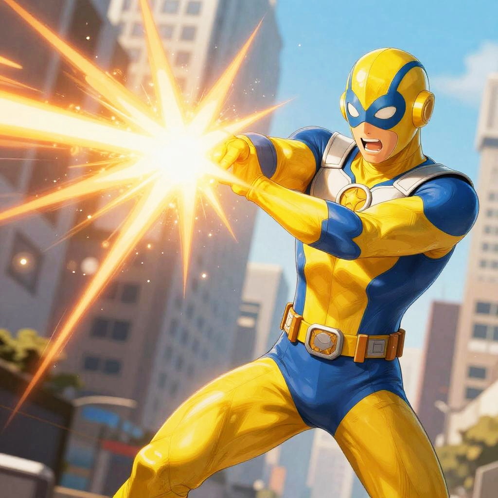Yellow and blue superhero in action mid-battle, vibrant energy blasts, detailed costume textures, urban background with tall buildings, intense expression, digital art