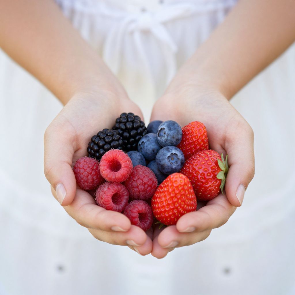 Photograph of two light-skinned hands gently cupping a colorful assortment of fresh berries. The berries include bright red raspberries, vivid red strawberries, dark blackberries, and deep blue blueberries. The hands are positioned in the center of the image, with fingers slightly curled to cradle the fruit. The background is a soft, out-of-focus white, drawing attention to the vibrant berries. The texture of the berries contrasts with the smoothness of the hands, highlighting their natural, juicy appearance. The image exudes freshness and natural beauty.