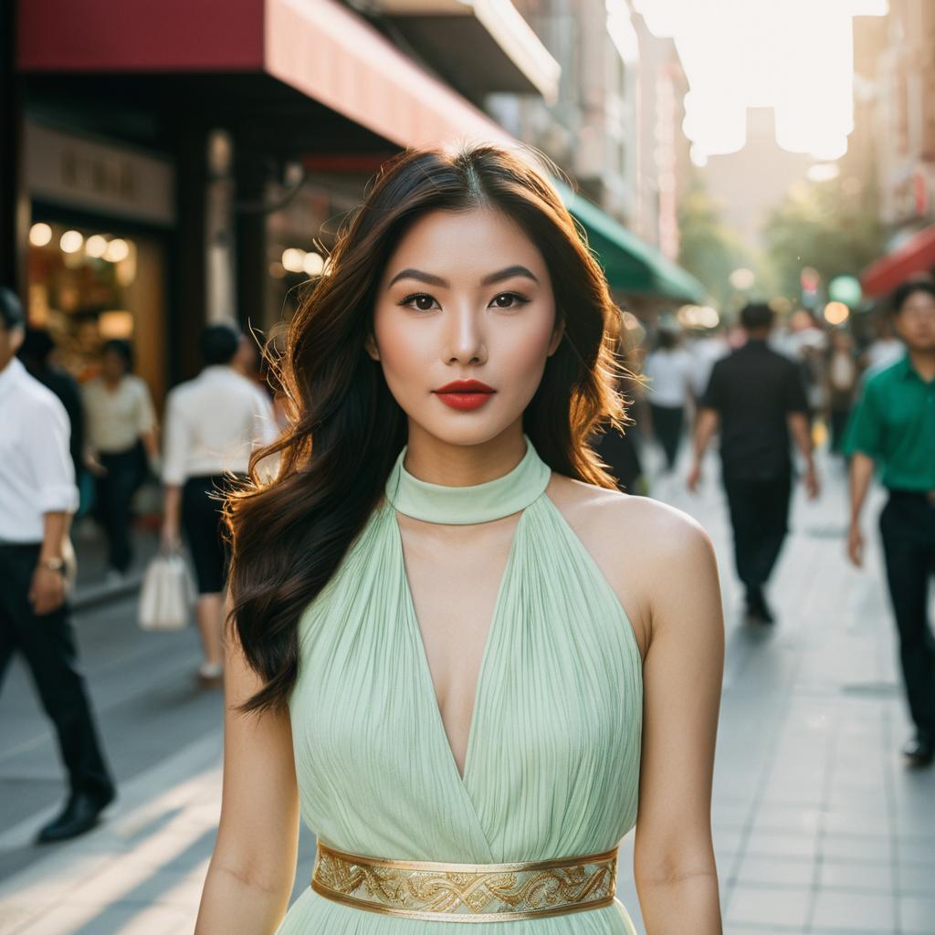 Photorealistic portrait of an attractive young Asian woman, standing in a bustling street, daytime, urban setting, soft sunlight, wearing an elegant, light green, sleeveless, high-neck, halter dress with gold embroidery and a wide gold waistband, her long, wavy, brown hair falling over her shoulders, delicate makeup with pink lipstick, calm and confident expression, slight blush, background blurred with people walking, shops with red and green awnings, buildings with white and beige facades, street surface slightly ured, realistic lighting and shadows, slight bokeh effect, model facing slightly to the right, slightly tilted head, background depth of field, cinematic style, high detail, fashionable, sophisticated, elegant, street fashion, urban chic, summer dress, traditional Asian influences in clothing design, realistic ures, lifelike, attractive and graceful, beautiful facial features, confident pose, stylish and classy, visually appealing, detailed clothing ures, realistic skin tones, subtle highlights and shadows.