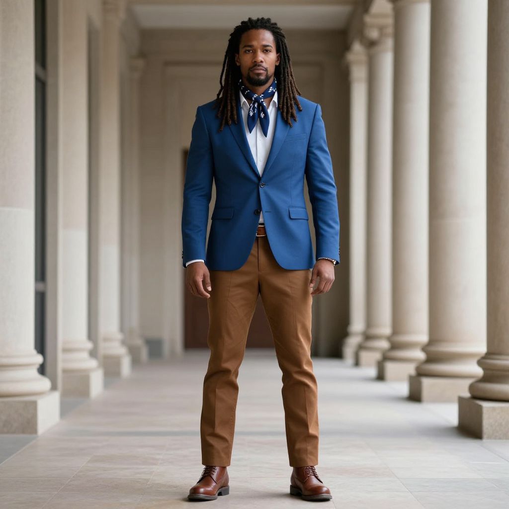 A stylish Black man with long dreadlocks stands confidently in a grand classical hallway with tall stone columns. He is dressed in a sharp blue blazer over a white shirt, accessorized with a patterned navy scarf tied around his neck. He wears tailored brown pants, brown leather boots, and a matching brown belt. The setting suggests a formal or professional atmosphere with architectural elegance.