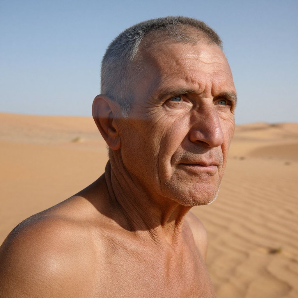 A captivating double exposure portrait depicts a stoic elderly man with weathered skin and piercing blue eyes against an expansive desert backdrop. The intense sunlight casts deep shadows across his rugged features, creating a striking contrast with the golden sands behind him. His intense gaze seems to search beyond the horizon, while the secondary imagery of the barren desert merges seamlessly with his skin tone, emphasizing resilience and solitude amidst harsh light and shadow.