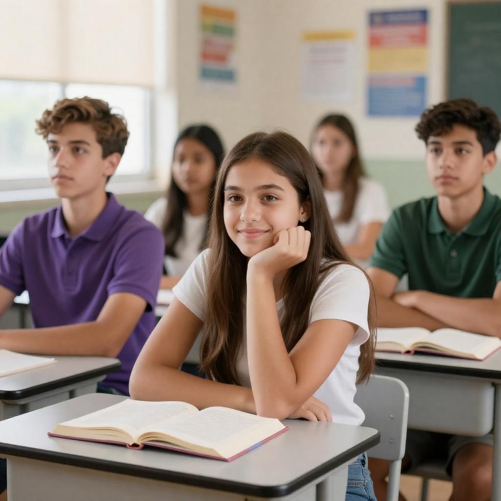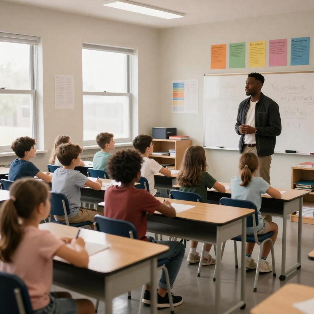 Photograph of a classroom. Black male teacher with short hair, dark jacket, standing right side. Ten children, diverse ethnicities, seated at desks, focused on work. Bright light from two windows on left. Whiteboard on right, colorful posters above. Shelves with books and supplies on far right. Teacher speaking to the class. Dimly lit room.