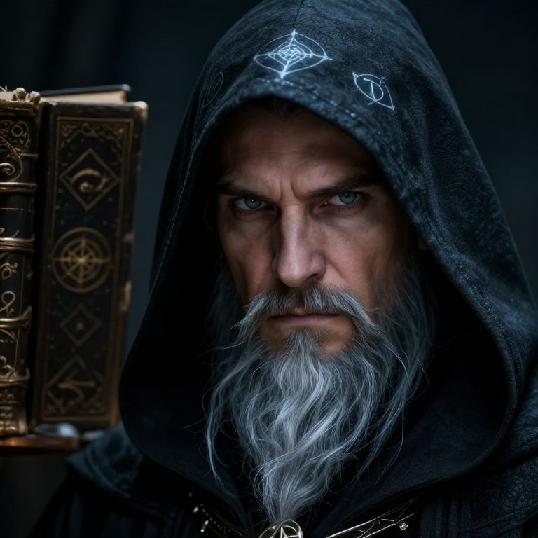 Photorealistic digital artwork depicting a stern, middle-aged man with a long, white beard and piercing blue eyes. He wears a black hooded robe adorned with glowing white runes. The man holds an ornately decorated, gold-embossed book with intricate patterns. The dark, blurred background contrasts with his intense gaze and the illuminated runes on his robe. The texture of his beard and robe is detailed, highlighting the realism of the digital medium. The lighting emphasizes his facial features and the mystical nature of the scene.