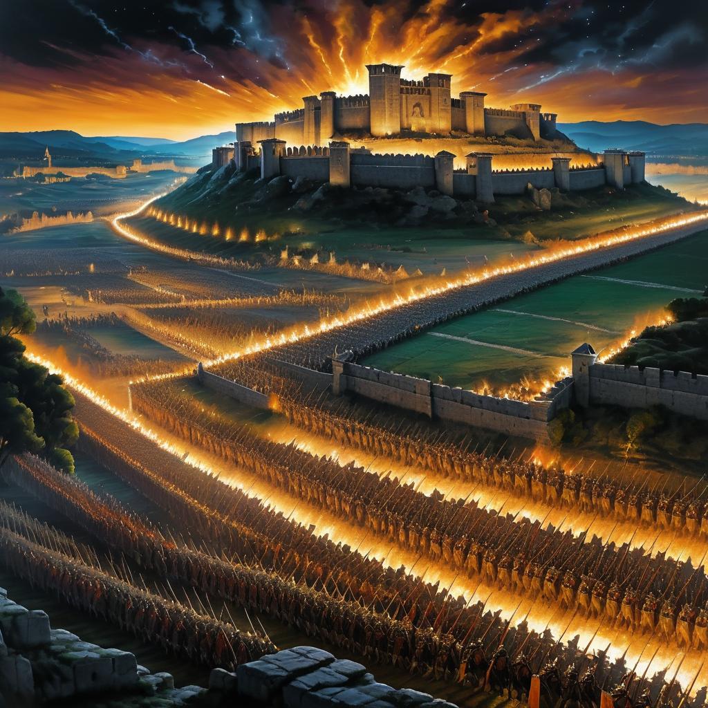 Landscape Painting a roman general looking over his army of ten thousand equites as they march towards a fort, background of a magnificent gothic fort with tall granite walls, catapults bombarding the fort, night, bright with by torch light, wide angle,