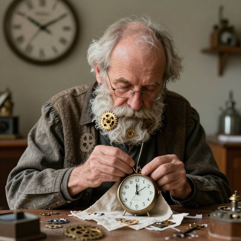 An elderly clockmaker, his beard woven from gears and tardiness, stitches hours into patches of reality with patients who time-travel via sleep.