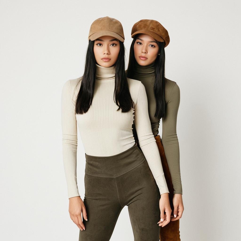 Woman, minimalist chic, beige turtleneck bodysuit, long sleeves, seamless fit, olive high-waisted leggings, fitted silhouette, neutral colors complementing each other, suede cap matching leggings, long straight black hair, plain white studio background.