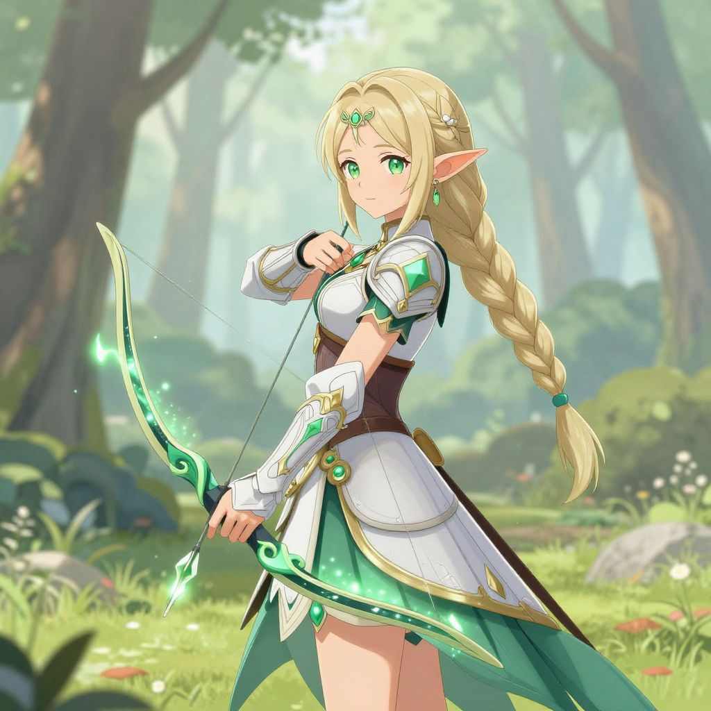Anime girl elf in a serene woodland clearing, wearing intricate elven armor with emerald and gold accents, holding a bow with luminous arrows, long braided hair cascading down her back, elegant pointed ears, soft pastel color palette, enchanting magical atmosphere, ultra-detailed character design.