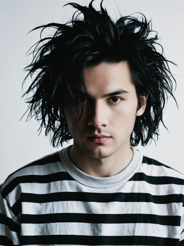 Portrait of a young adult man with spiky messy black hair wearing a black and white striped shirt. He has a serious expression and is looking directly at the camera against a plain light background.