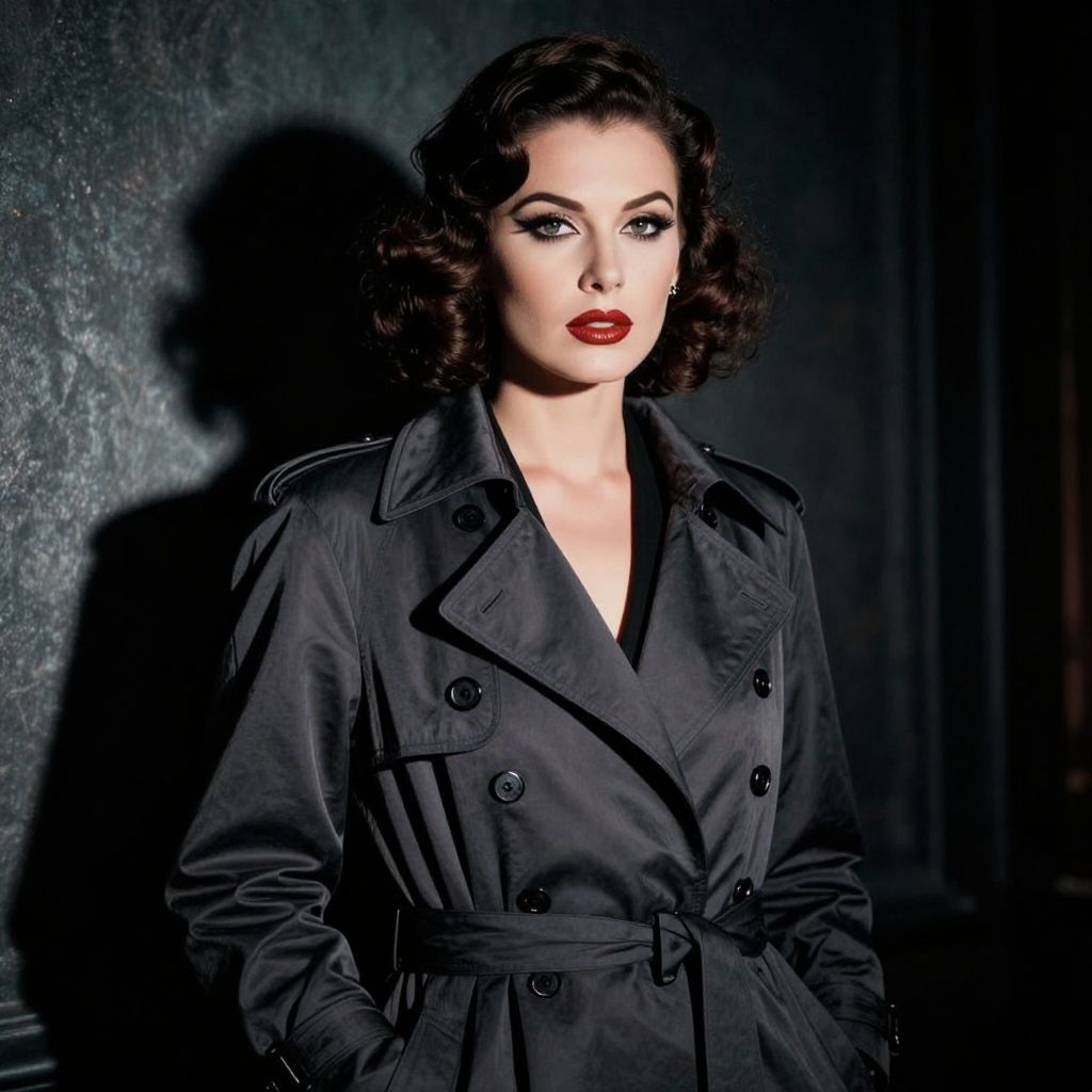 A high-definition digital illustration in a noir-inspired style, featuring a woman with vintage curls and dramatic makeup, clad in a sleek trench coat, set against a shadowy backdrop with striking contrast and moody lighting reminiscent of classic film noir aesthetics.