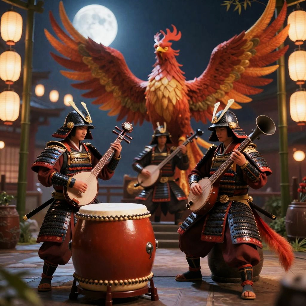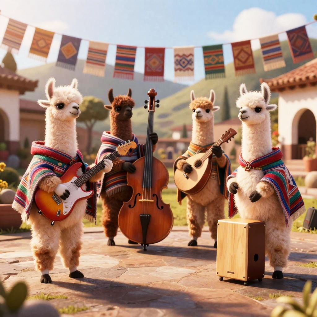 Highly detailed cinematic 3D render of four llamas playing as a rock band wearing Andean festival ponchos and woven chullos, each with colorful electric guitars, a fretless bass, a charango, and a wooden cajón percussion kit, on a terraced highland plaza hung with woven banners at golden hour