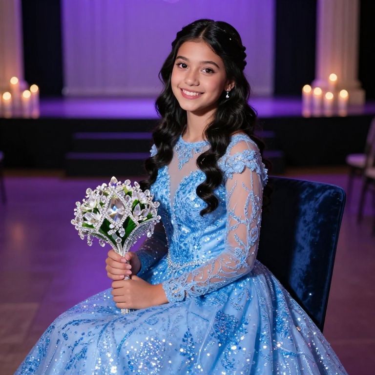 A stunning teenage girl with long wavy black hair and warm brown eyes in a blue glitter prom dress that glows softly in the dark; the dress features a high neckline, lace trim, and shimmering blue glitter across the bodice and sleeves; she is seated on a velvet chair in a grand indoor prom hall with a stage backdrop, holding a crystal bouquet and smiling upward at the camera, surrounded by candlelight and soft purple shadows.