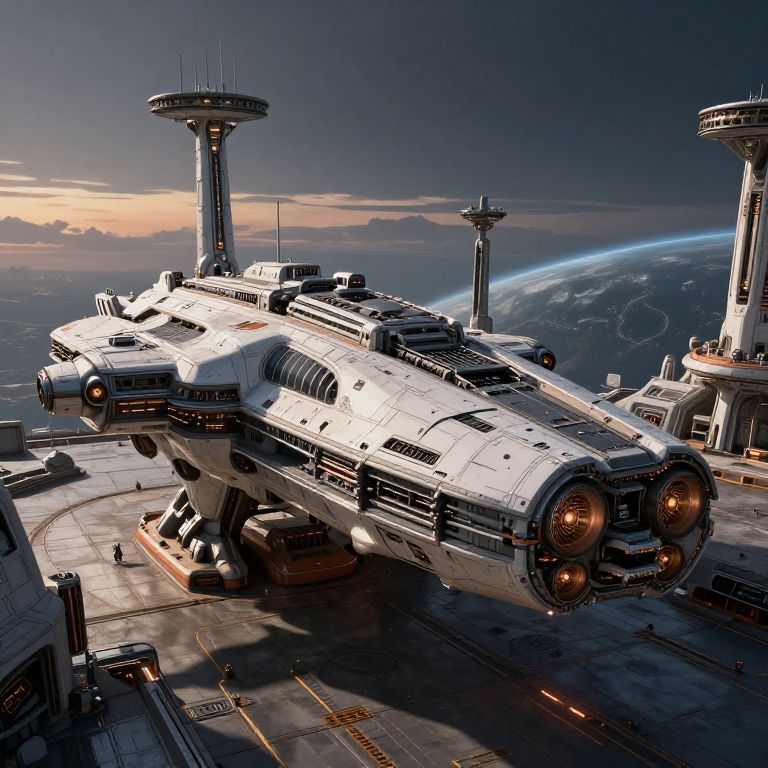 Photorealistic CGI of a futuristic, white spaceship with large engines on a space station, illuminated by sunset, with planet visible in the background.