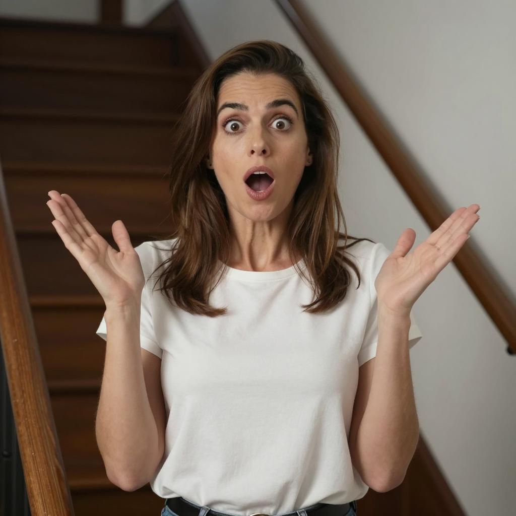 Woman with shoulder-length brown hair, wearing a white short-sleeved blouse, stands with mouth open and hands raised. Background includes dark wooden stairs and blinds. She looks surprised, right hand slightly raised, left hand near chest. Illuminated from the left.
