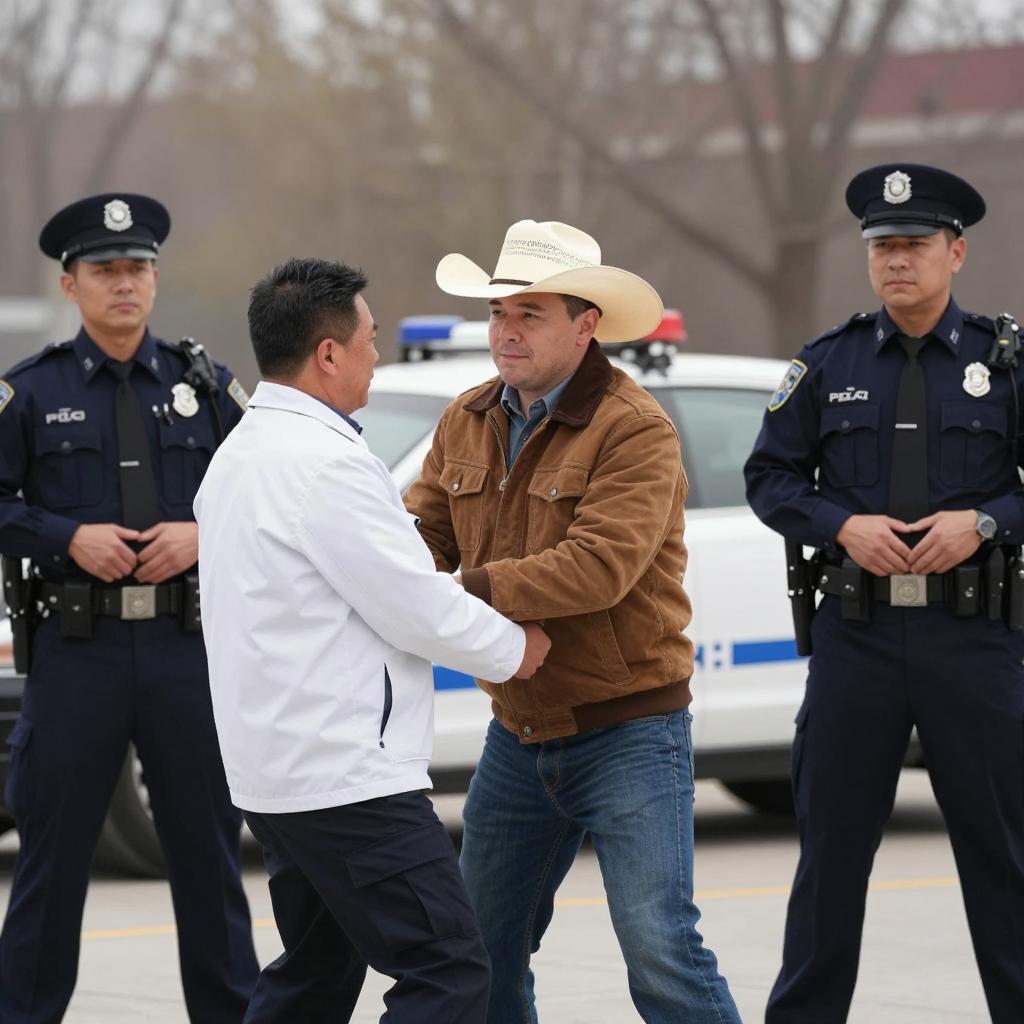Photograph of two men in a gymnasium. The man on the left wears a blue cap, red and white fringe jacket with stars, and a blue bow tie. The man on the right wears a dark suit, patterned tie, and holds a red balloon and papers. They are facing each other, smiling, with chairs and a banner in the background.