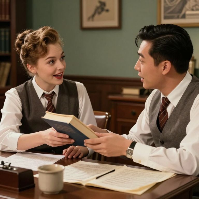 Two individuals engage in a lively conversation, with one person handing over a book while seated at a desk in a classic mid-century setting.