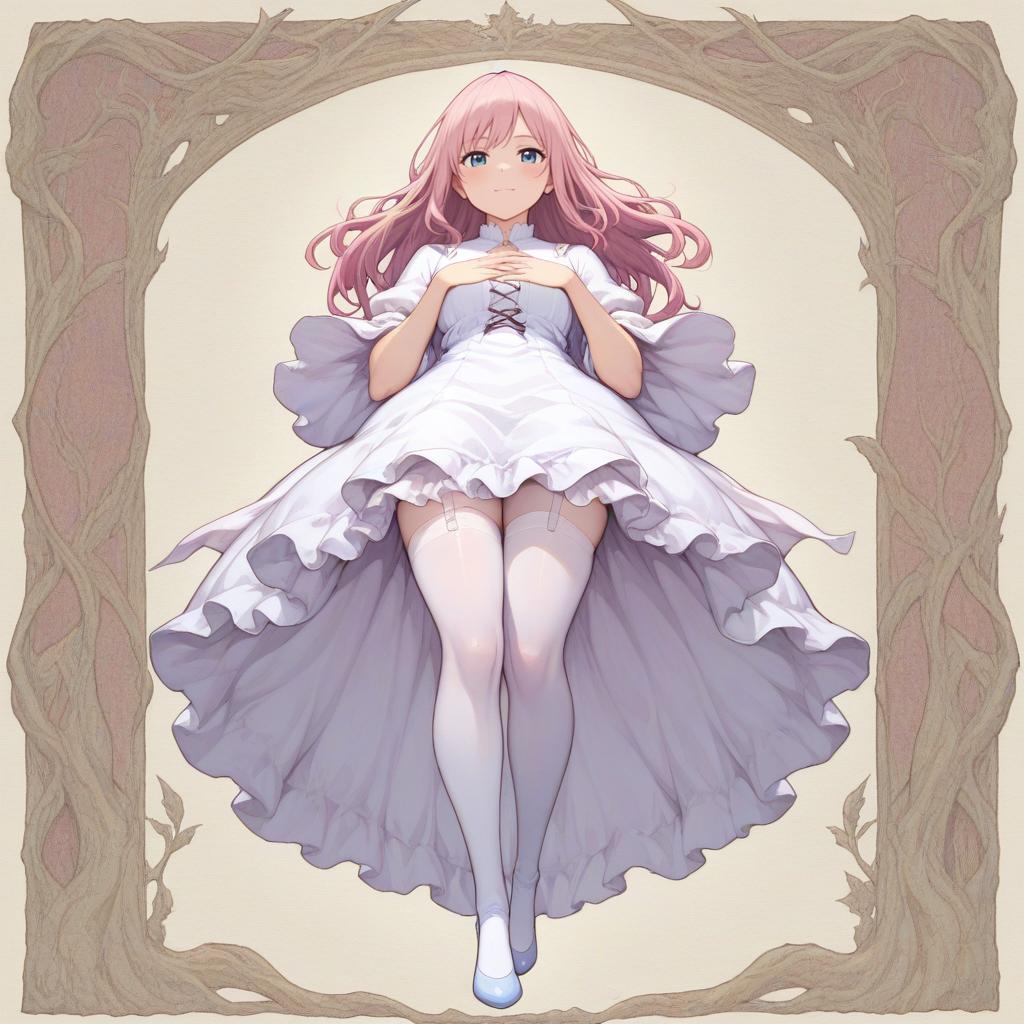 Watercolor, masterpiece, best quality, extremely detailed, 1girl, full body, beautiful detailed eyes, cute anime face, beautiful detailed face, pink hair, (Botanical illustration:1.5), white dress, white legwear